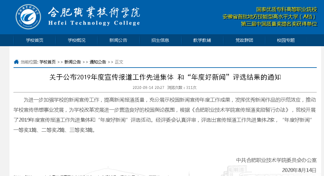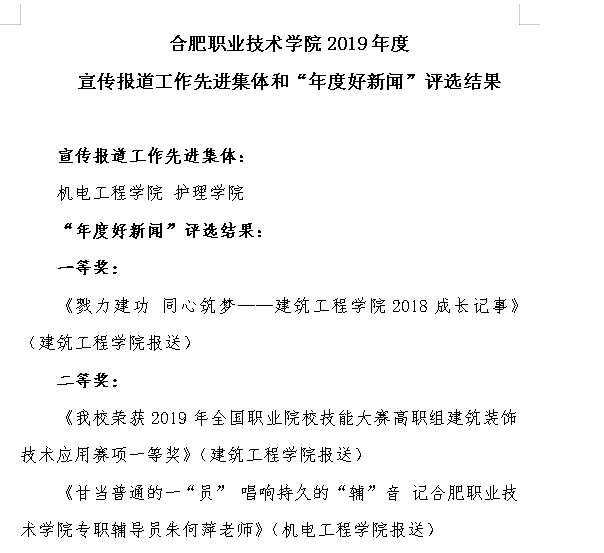 一年来,在学校党委的正确领导下,在全院教职工的大力配合下,学院深入挖掘教学、科研、人才培养工作成就和特色,积极开展新闻宣传工作,服务学校改革和学院发展大局,及时向校内外媒体报送了大量反映本单位工作特色和亮点的优秀稿件,2019年共发表新闻稿件91篇,其中外发安徽省教育网17篇。学院不断完善网站与新媒体建设,有效提升了影响力,助推了学院的内涵建设与发展。经学校党委宣传部评审,永利官网获评2019年度合肥职业技术学院宣传报道工作先进集体,新闻稿《甘当普通的一“员” 唱响持久的“辅”音 记合肥职业技术学院专职辅导员朱何萍老师》获评“年度好新闻”二等奖。