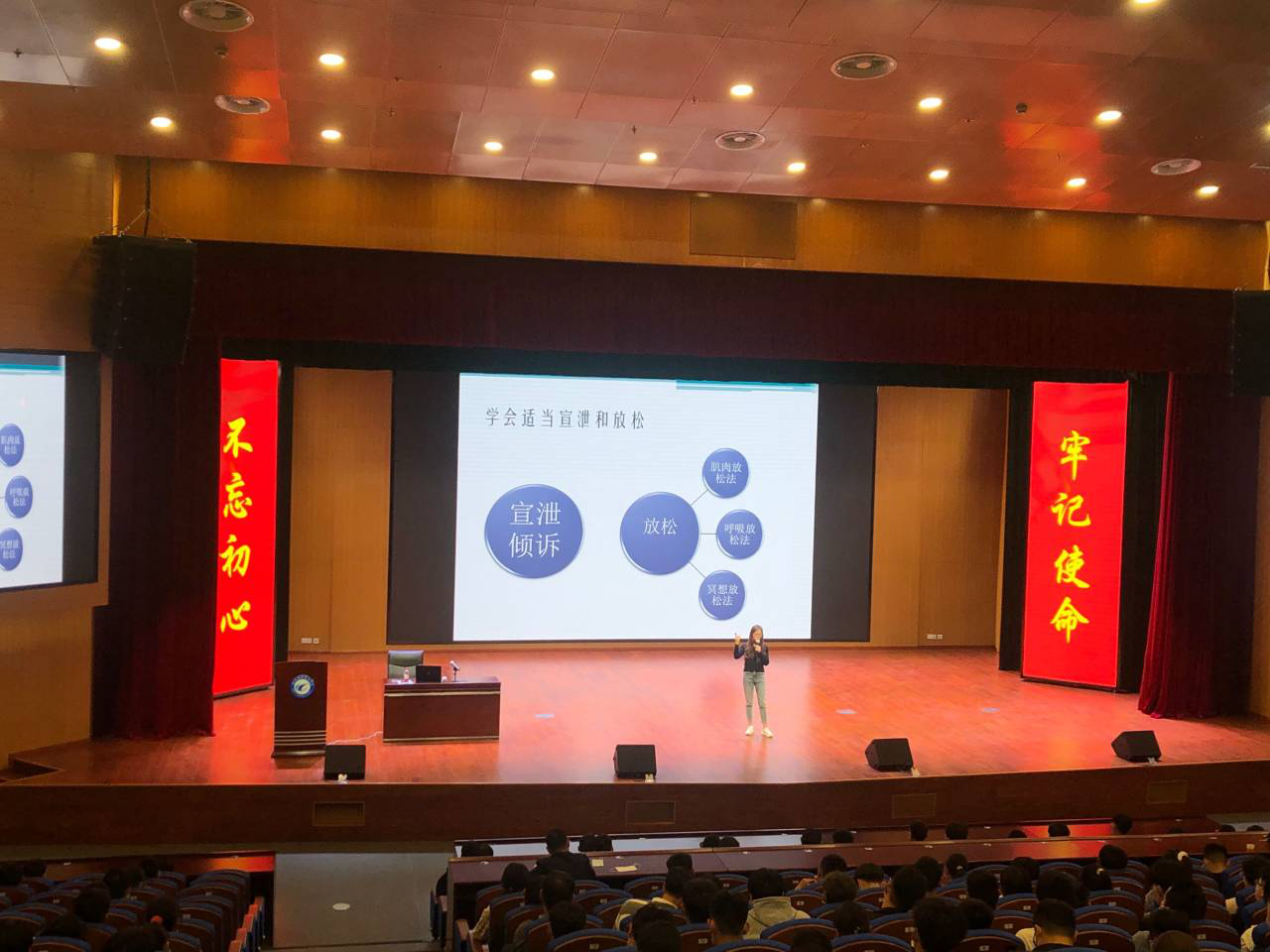 最后,由学生处大学生心理健康教育指导中心的孙月老师为全体同学开展新生适应讲座。讲座以什么是大学、大学新生适应问题、大学新生的自我修炼三方面内容展开,孙老师以生动的案例和细致的讲解,让学生了解到进入大学这个新环境以后可能会面临的问题和困惑,以及处理问题、进行自我调适的方法。