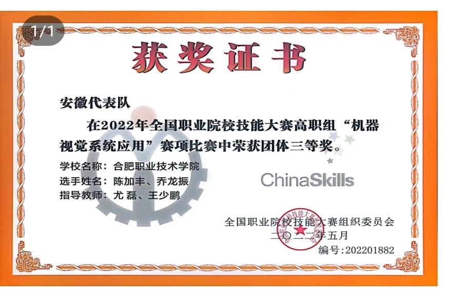 (1)高职组“机器视觉系统应用”赛项中陈加丰、乔龙振两位选手发挥出色,荣获团体三等奖。