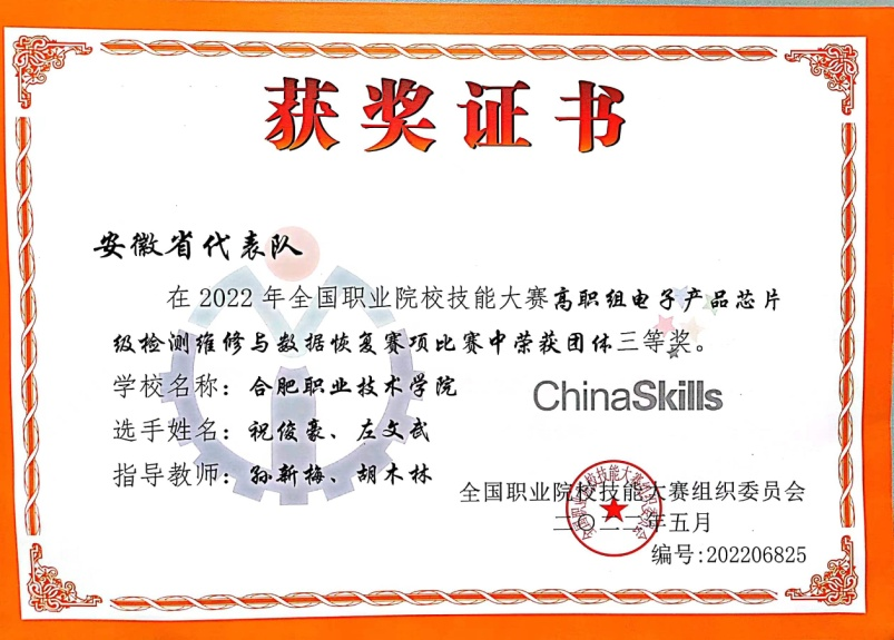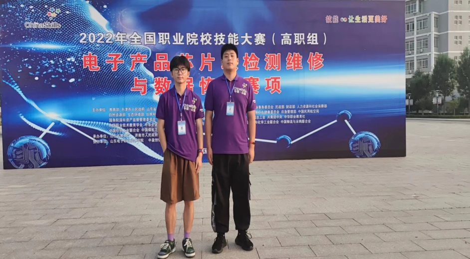 (2)高职组“电子产品芯片级检测维修与数据恢复”赛项中祝俊豪、左文武两位选手发挥出色,荣获团体三等奖。