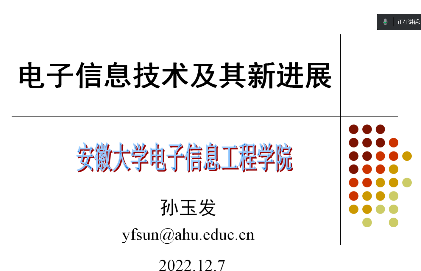 为使永利官网师生了解电子信息技术及其新进展相关知识,12月7日19:00-20:00,yl23411永利集团官网开展了“电子信息技术及其新进展”学术讲座,此次学术讲座主讲人为安徽大学电子信息工程学院教授、博士生导师孙玉发,yl23411永利集团官网老师及学生通过腾讯会议的线上方式参加了此次讲座。