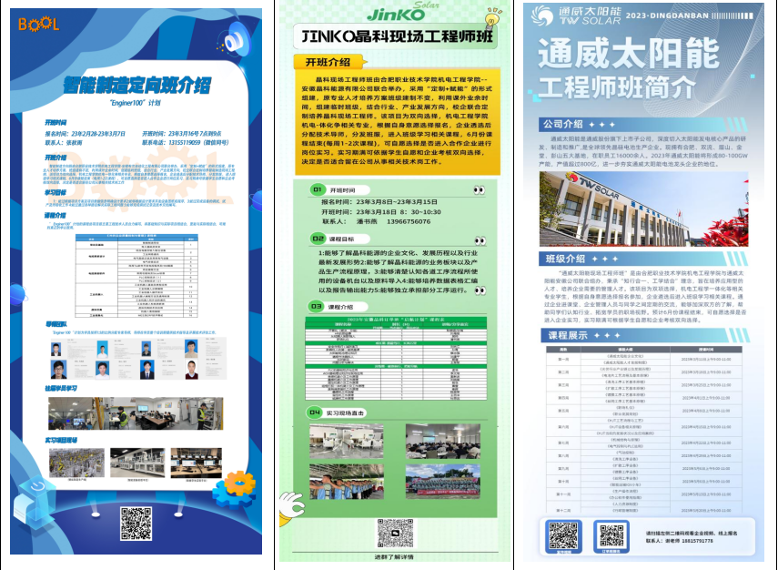 面对产业转型升级发展的新形势,现场工程师已经成为先进装备制造业乃至整个国民经济发展的迫切需求。根据现场工程师“出现”于生产和建设一线,“现身”于管理和服务现场,“战斗”于一线职业场景,具备工匠精神,“精操作、懂工艺、会管理、善协作、能创新”,能第一时间解决现场问题的特点,yl23411永利集团官网根据合肥市高端装备制造业的岗位需求,在与安徽博清自动化科技有限公司、安徽中显智能机器人有限公司组建的智能焊接订单班和机器视觉“尖兵班”的基础上,联合安徽晶科能源有限公司组建晶科现场工程师班,安徽布尔自动化工程有限公司智能制造定向班,通威太阳能(安徽)有限公司通威现场工程师班。