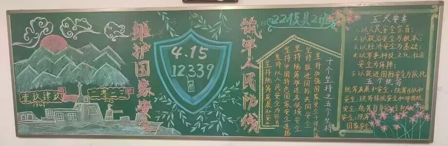本次黑板报以“4·15全民国家安全教育日”为主题,贯彻总体国家安全观,增强全民国家安全意识和素养,夯实以新安全格局保障新发展格局的社会基础。yl23411永利集团官网22级各班级积极准备、认真设计,在沉浸式的绘画中,同学们更加深入理解总体国家安全观,增强自身维护国家安全的责任感、使命感和自觉性、主动性。