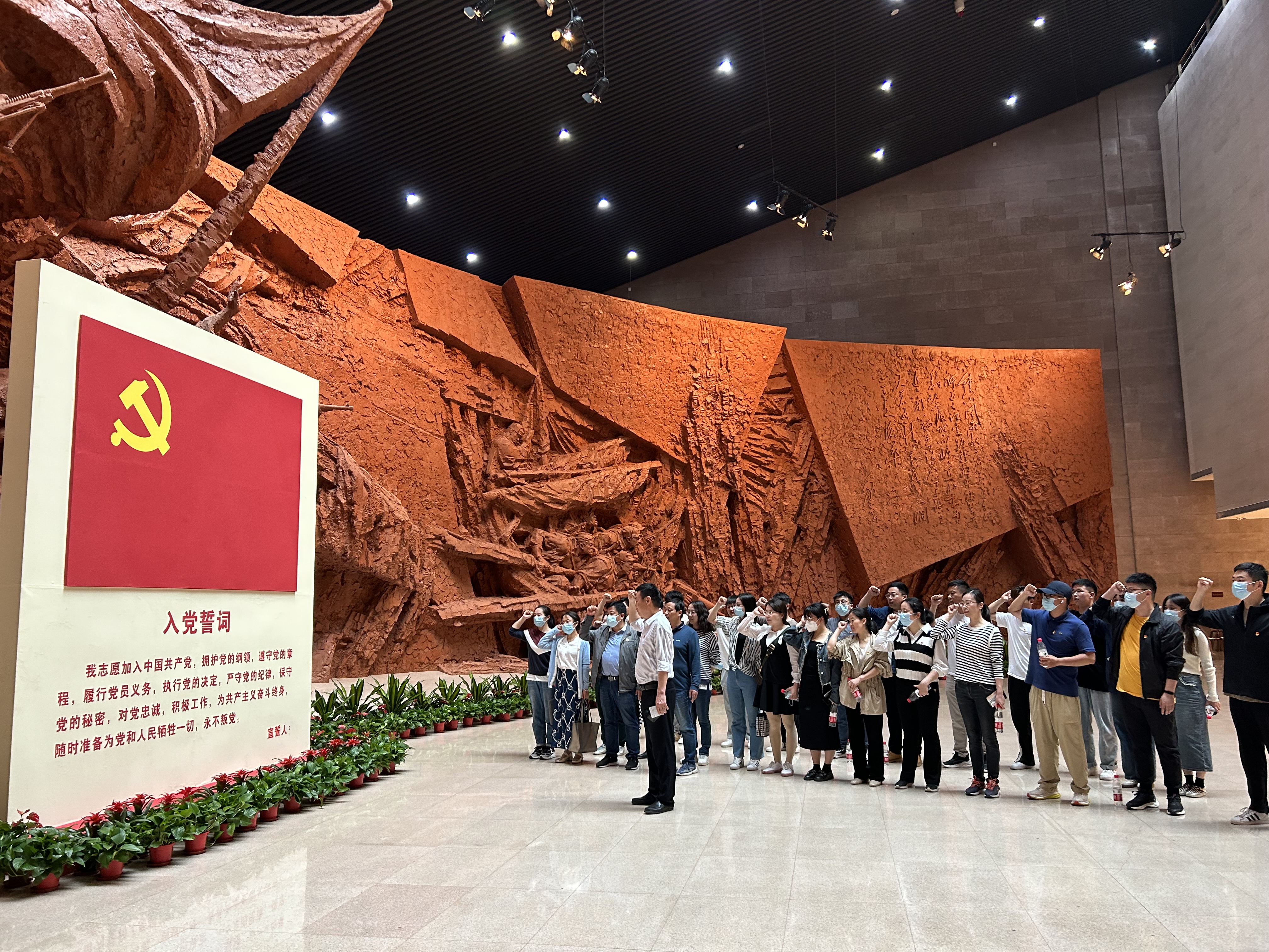 全体党员在渡江战役纪念馆一楼大厅,面对鲜红的党旗,集体重温入党誓词。同志们举起右拳,庄重宣誓,誓言铿锵,激昂回响。