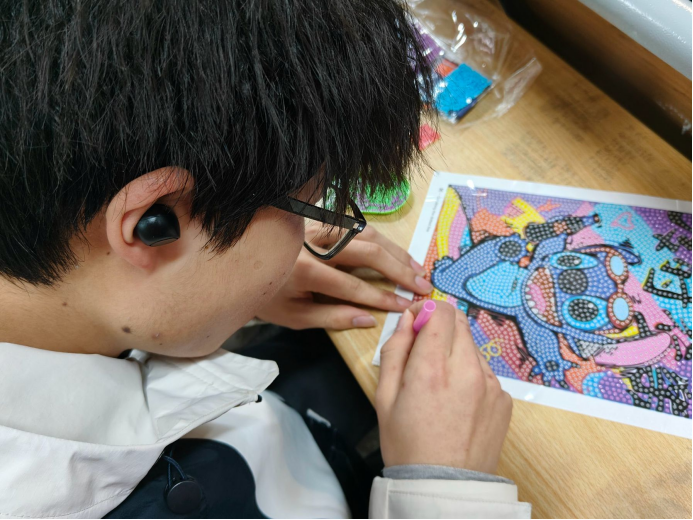 本次活动吸引了众多同学的参与,他们积极响应,踊跃报名。活动现场一片欢声笑语,气氛热烈。在心理部成员的指导下,同学们分组进行了创意贴画。通过小组合作,他们发挥想象力,用彩色钻石贴画搭配出各种独特的图案和形状,展现了他们的艺术才华与团队精神。