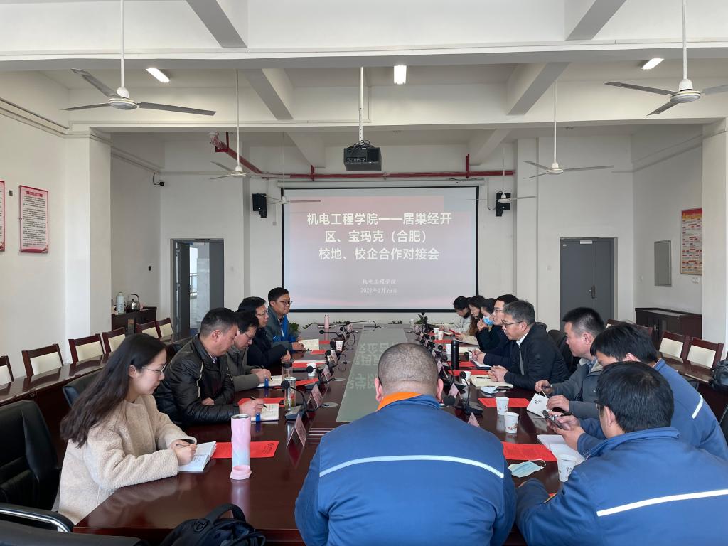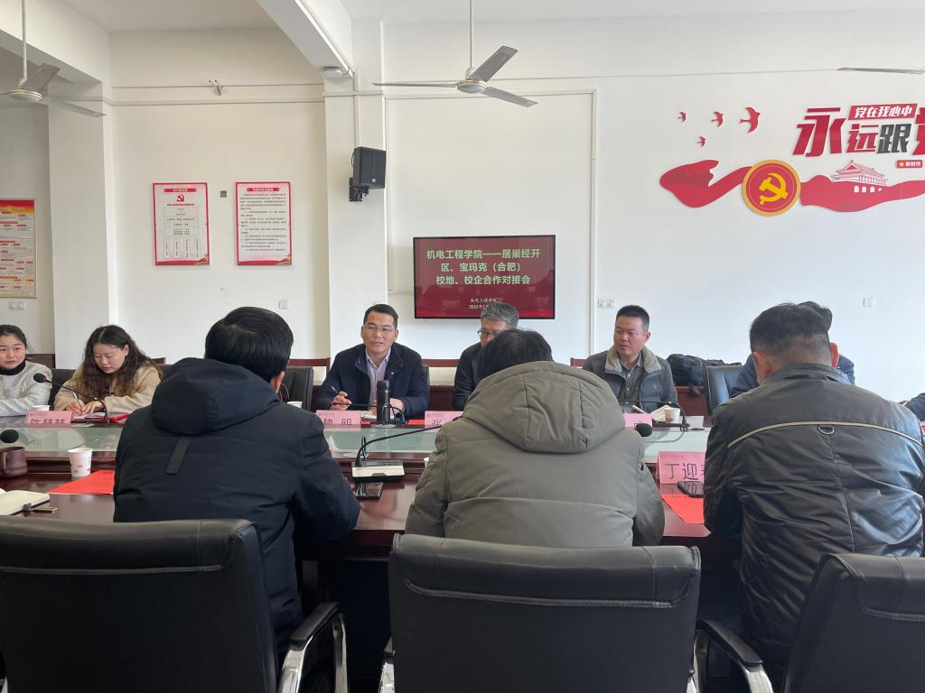 2月25日下午,安徽居巢经济开发区党工委副书记、管委会副主任魏明,宝玛克(合肥)科技有限公司总经理张明,巢湖宜安云海科技有限公司常务副总沈燕辉及相关人员赴yl23411永利集团官网进行校地、校企合作对接。校党委委员、办公室主任王海,yl23411永利集团官网党总支书记王克勇,学院院长胡木林、院党总支副书记丁迎春及部分教师参与此次对接会,会议由王克勇主持。