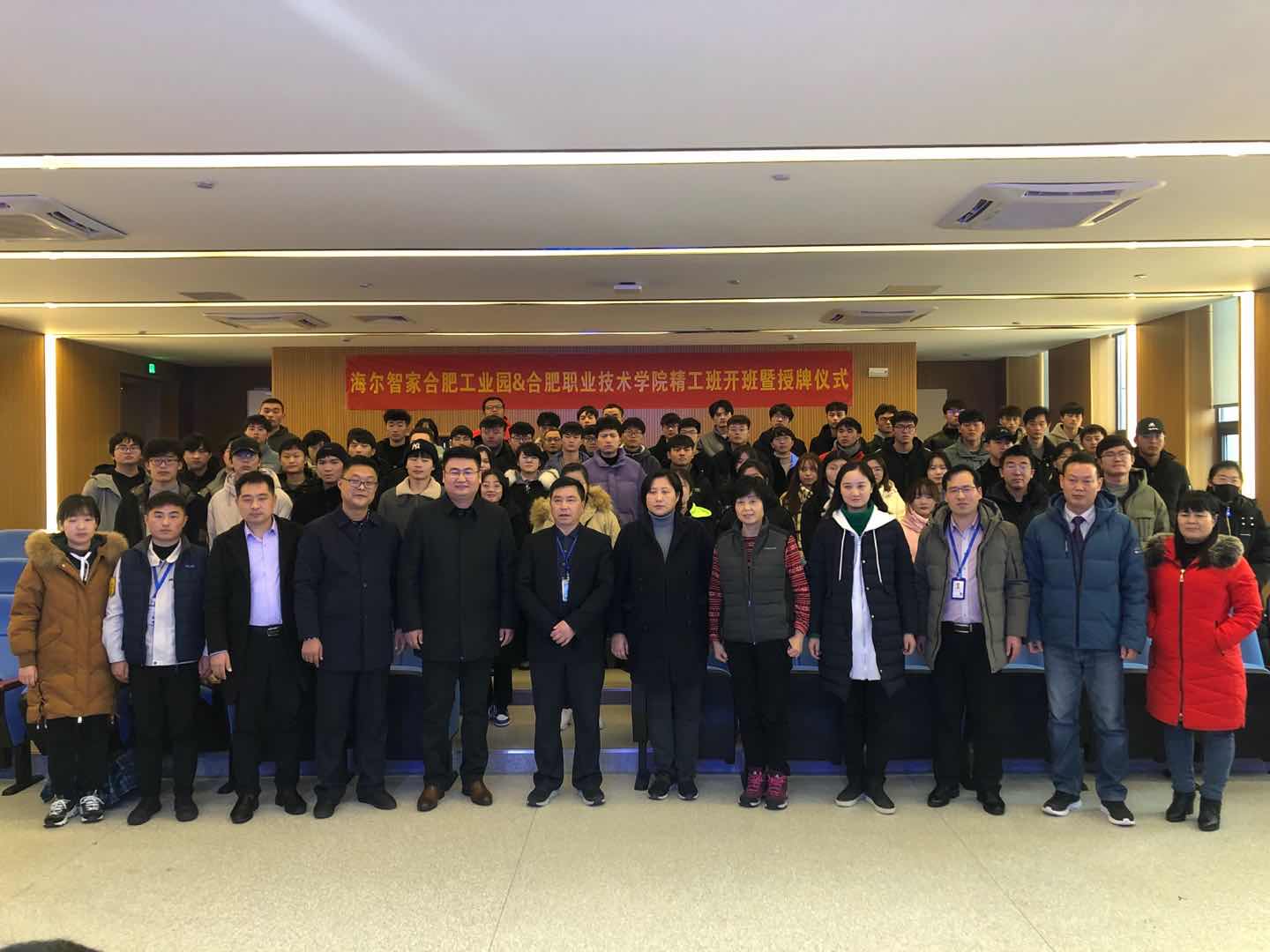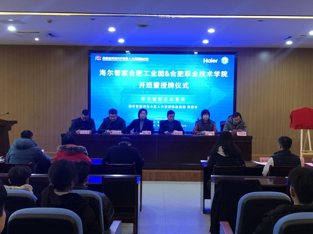 12月29日下午,yl23411永利集团官网与海尔智家合肥工业园精工班项目开班暨授牌仪式在汇心湖校区图书馆一楼学术报告厅举行。经开区人力资源中心副主任郑静、经开区人力资源中心企业服务部部长焦妮娜、海尔智家华东大区人力资源高级经理柯艮东一行、安徽爱沃客信息科技有限公司高级顾问纪丽一行、校党委副书记胡其云、yl23411永利集团官网党政领导班子成员、精工班全体同学及相关专业教师参加项目开班授牌仪式。