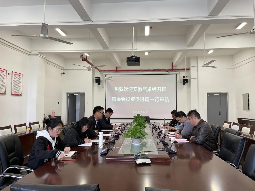 3月30日下午,安徽居巢经开区管委会投资促进局携上海钟盈企业发展有限公司一行来访yl23411永利集团官网,双方就校企合作进行了交流。安徽居巢经开区管委会投资促进局彭琴、上海钟盈企业发展有限公司副总经理宋斌、招聘经理李峰、项目经理温涛、yl23411永利集团官网党总支副书记(主持工作)王克勇,学院副院长孙新梅、院党总支副书记丁迎春及相关教师参与此次会议。