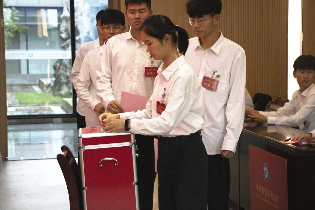 下午五点,第二次会议及闭幕式准时开始。首先,代表们充分发扬民主,以无记名的方式进行投票。经过紧张、认真、谨慎的选票统计,总监票人宣布本届主席团选举结果,任克杰、沐俊安、陈强当选合肥职业技术学院yl23411永利集团官网第四届院学生会主席团成员。