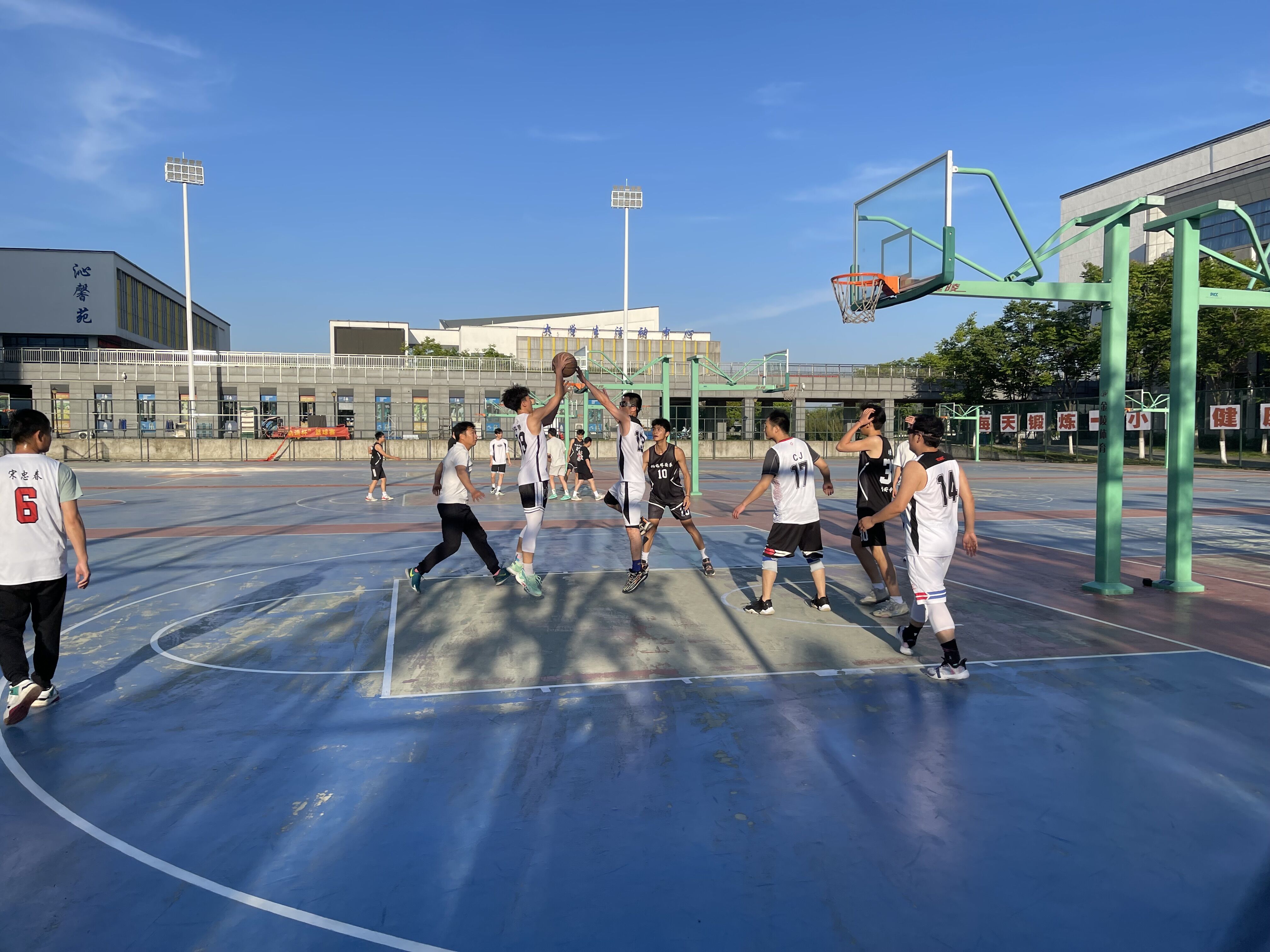 比赛过程中,参赛的每一位师生都精神饱满,斗志昂扬,双方你来我往,相互切磋,在不断地进攻和防守中,迅速拉近了师生关系。篮球场上,不仅有球员们的飒爽英姿,还有拉拉队的加油助威。他们拉起横幅、激动呐喊,因进球而雀跃的欢呼,涌起青春的滚滚浪潮。观赛队伍随着赛程的激烈进展不断扩大,有闻声而来的老师同学、教师球员的家属孩子……赛场上球员们挥汗如雨,赛场下观众们也热血澎湃,大家用热情点燃青春火焰。